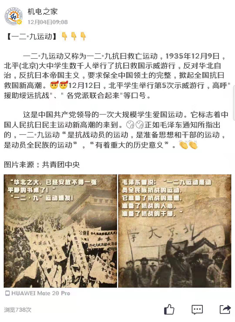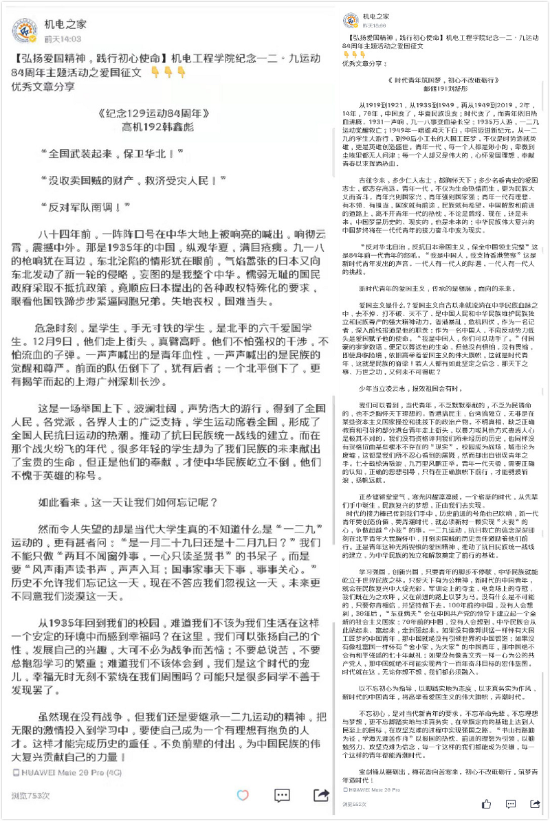 米乐mile官方网站面向全体2019级青年学生开展“纪念一二•九运动”爱国主题征文活动,征文活动发出后,受到广泛且热烈的追捧,经选拔,共计五篇优秀征文脱颖而出,在学院学生会自媒体平台“机电之家”公众号上推广展示。
