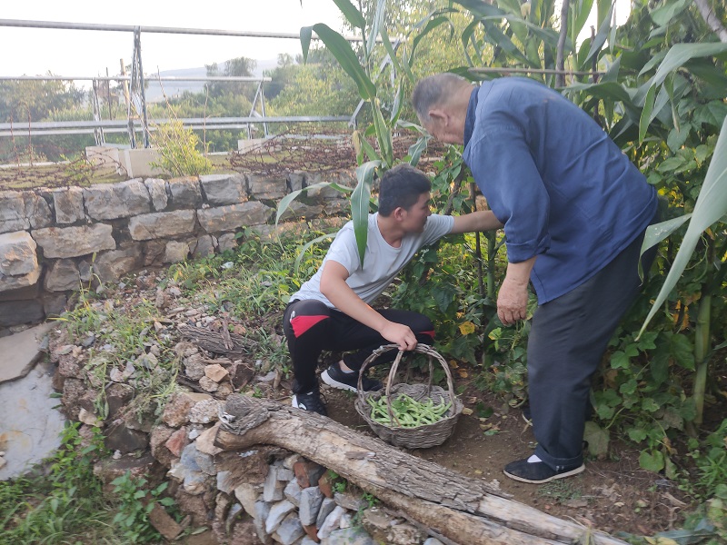 在队员裴晓亮帮助老人的过程中,他看到了农村老人们由内而外的朴素与善良,在采摘果蔬的同时,也学到了一些简单的农作知识。这些农村老人虽腿脚不便,但总能娴熟的采摘玉米。队员们运用自己已学知识,主动帮助老人简单的打理菜园。