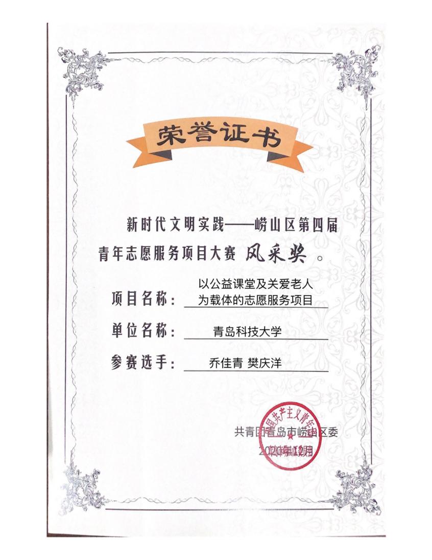 12月17日 ,由青岛市崂山区文明办、团区委和区青年志愿服务联盟联合举办的“新时代文明实践——崂山区第四届青年志愿服务项目大赛”顺利开展。米乐mile官方网站团委志工部部长胡福超老师带领学生代表乔佳青、樊庆洋,积极参与、认真准备,青尘义工队“以公益课堂及关爱老人为载体的志愿服务项目”经作品申报、资格筛选、项目展示、评审打分等环节,最终获得大赛风采奖。