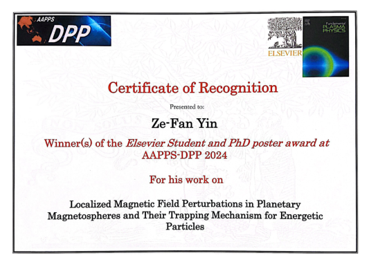 此外,在马来西亚马六甲召开的第八届亚洲-太平洋等离子体物理大会(AAPPS-DPP 2024)上,72886必赢欢迎光临空间物理与应用技术研究所博士研究生尹泽藩做邀请报告,并展示了题为“Localized Magnetic Field Perturbations in Planetary Magnetospheres and Their Trapping Mechanism for Energetic Particles”的海报,荣获大会爱思唯尔青年海报奖。该奖项由国际著名科学文献出版社爱思唯尔(Elsevier)资助设立,每年从被提名的博士生或博士毕业两年内的青年科学家中遴选出两名获奖者。