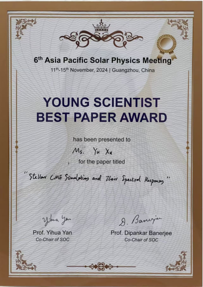 在近日于中国广州召开的第六届亚太太阳物理大会上,北大空间所2020级博士生徐昱获颁青年科学家最佳论文奖。该奖项颁给会议中优秀的学生/博士后报告或海报的展示者,国内外共计三人获奖。
