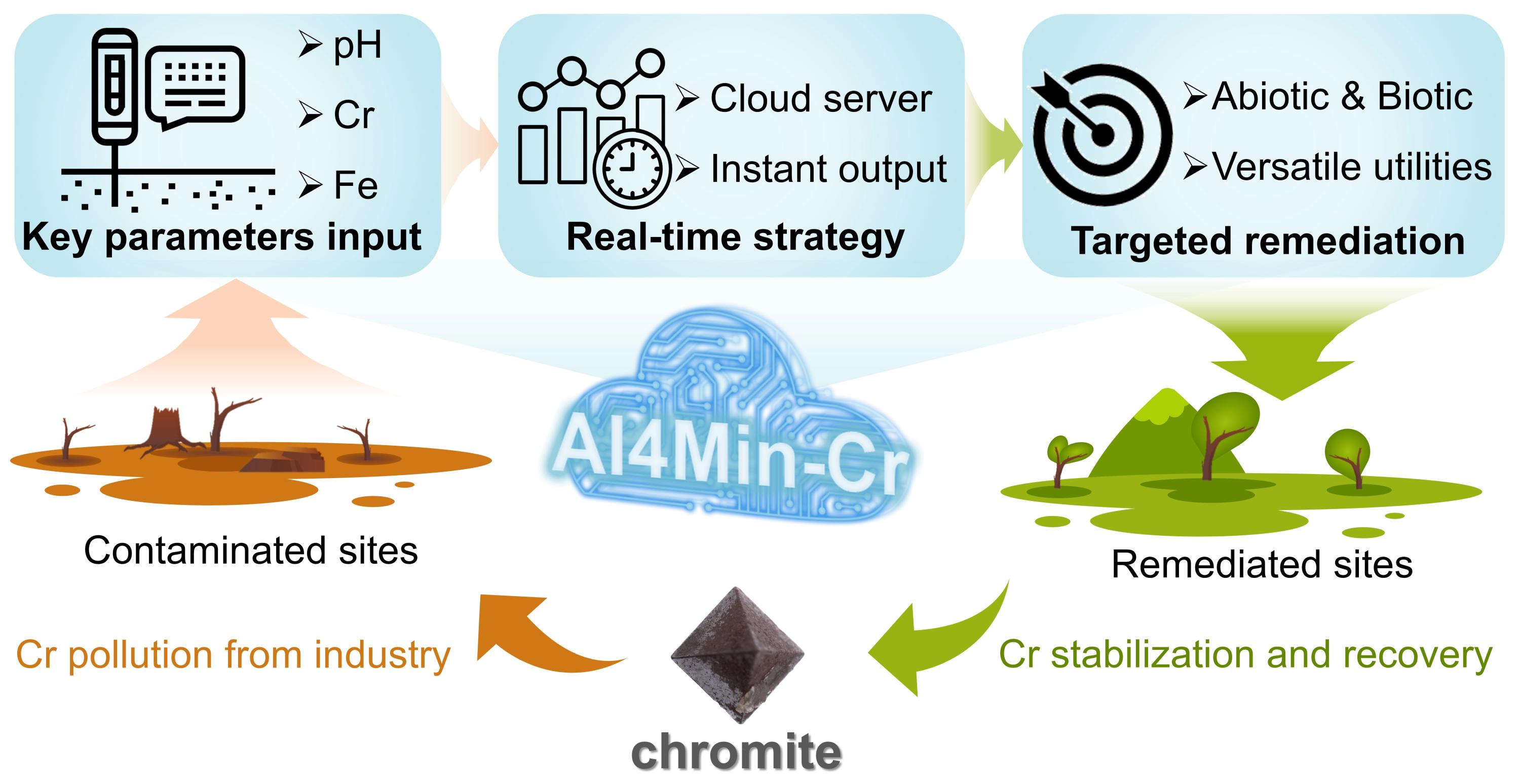 在当前AI时代背景下,团队积极倡导“数据驱动科学发现与开放共享”的理念,构建了包含近万组来自计算和实验数据的铬铁矿生成反应Gibbs自由能数据集,开发了在连续变量条件下铬铁矿沉淀的理论模型,并将其转化为AI4Min-Cr开源数据工具(http://cr.ai4mineral.com)。该工具可根据用户输入的pH值以及不同化学形态的Fe、Cr浓度等关键参数,通过动态建模生成定制化的铬污染修复方案。AI4Min-Cr是国际上首个将环境矿物学与矿物信息学相结合并面向环保应用的智能工具,体现了铬元素“从铬铁矿中来,再回到铬铁矿中去”的自然循环理念(图2),为铬污染的靶向治理提供了高效率、低成本的矿物学新策略。